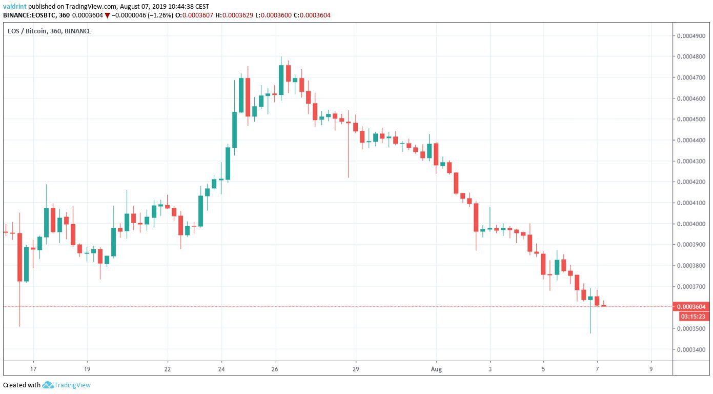 On July 16, 2019, the EOS price reached a low of 3505 satoshis. An upward move ensued. On July 26, it reached a high of 4799 satoshis. It has been decreasing since. On August 6, it reached a low of 3472 satoshis.