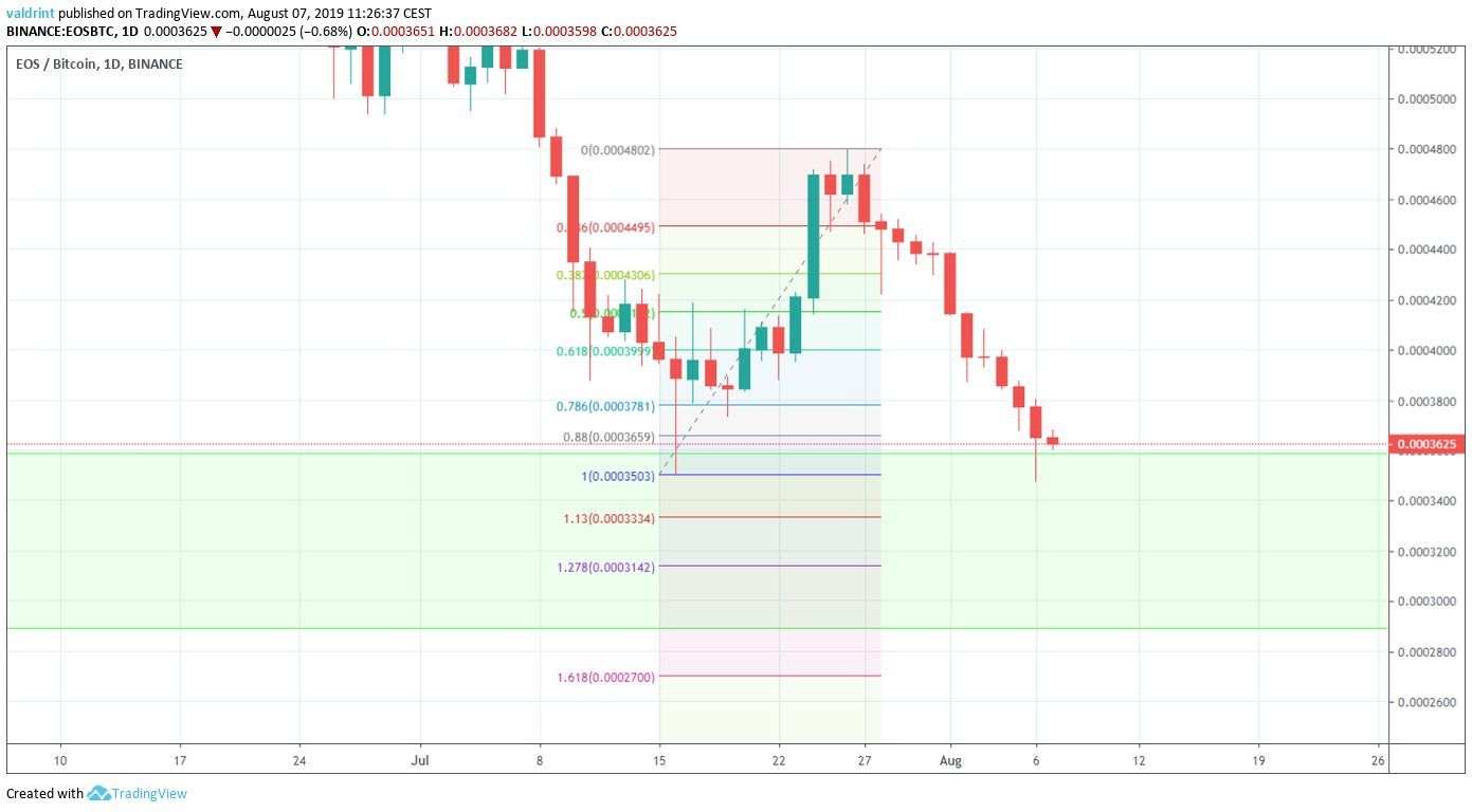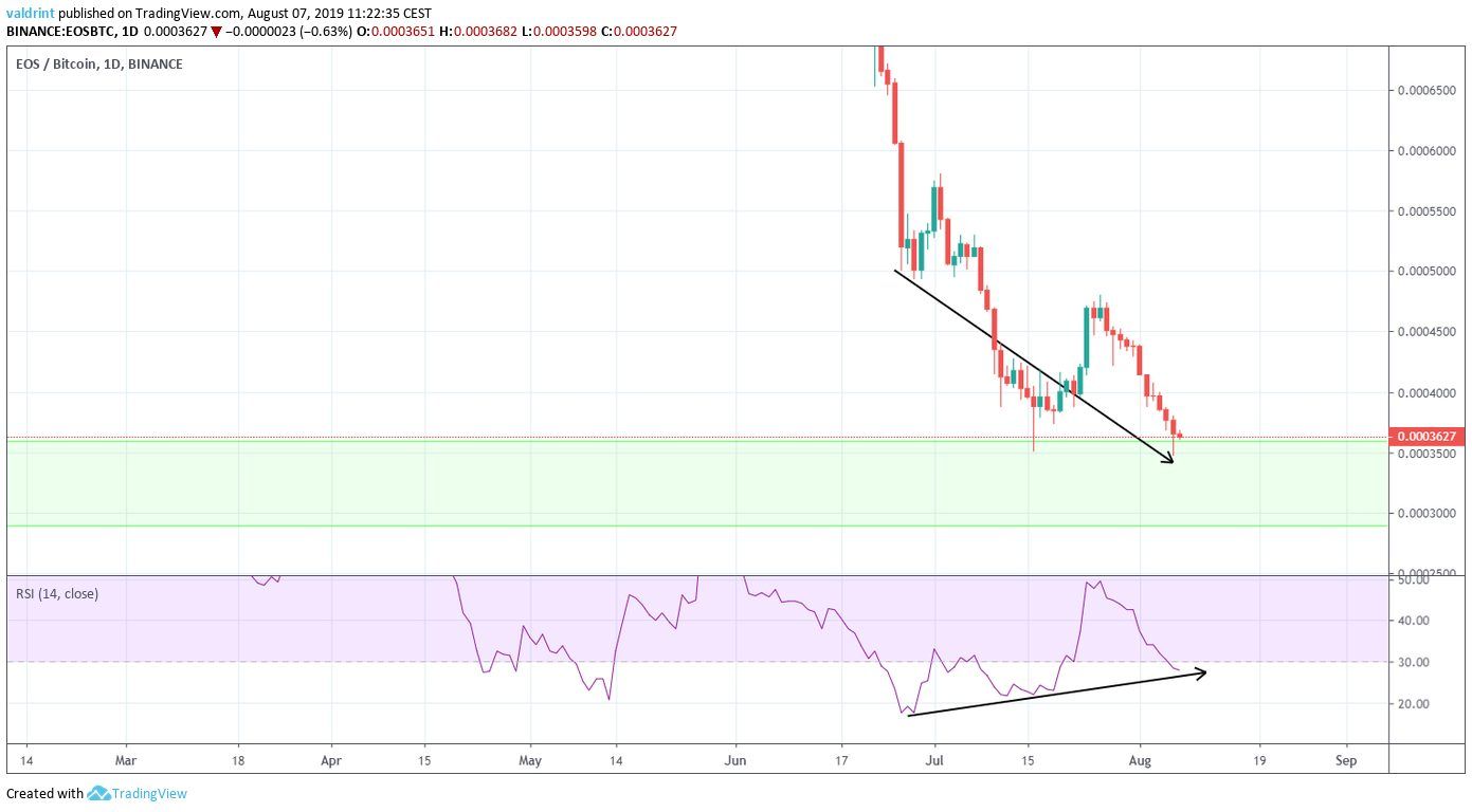 A look at the daily time-frame shows that the EOS price is trading inside a large support area that spans from 3000 to 36000 satoshis.