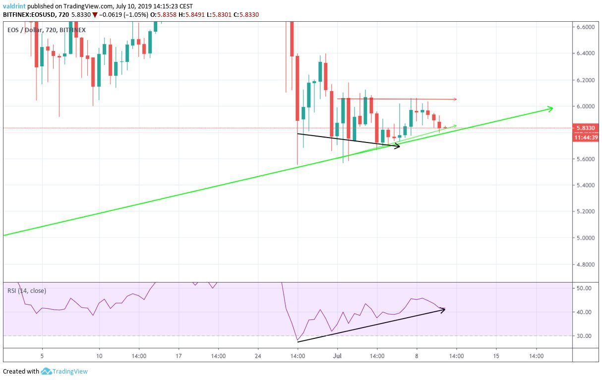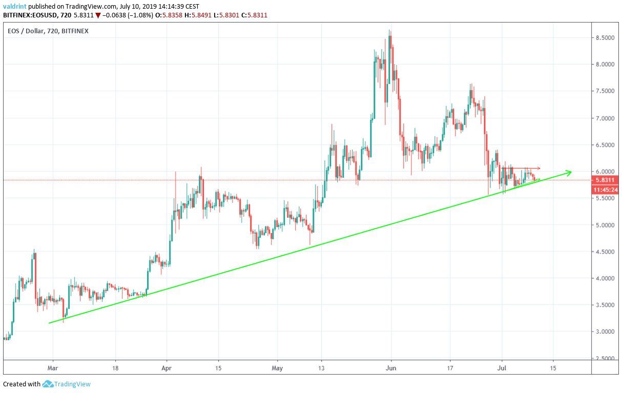 A look at the 12-hour time-frame shows that the EOS price has been following an ascending support line since the beginning of May.