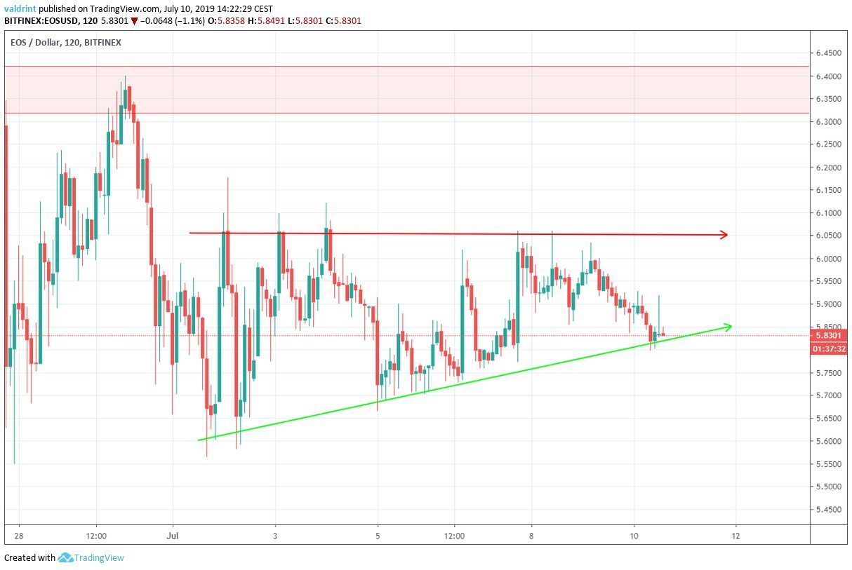 Since reaching a low of $5.56 on July 1, EOS has been gradually increasing — trading inside the ascending triangle outlined below:
