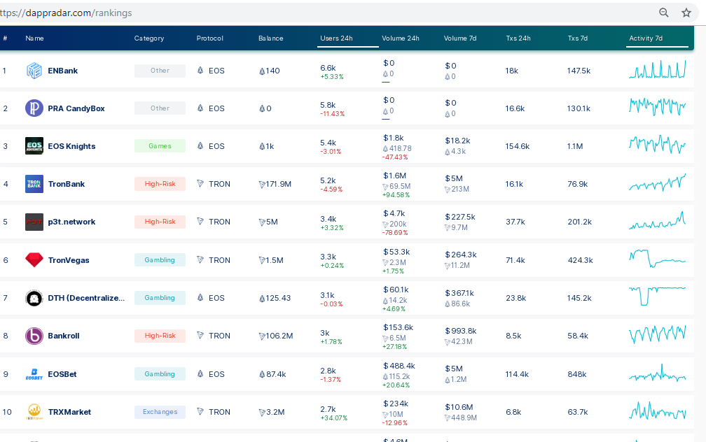 For example, Dapp Radar ranks dApps deployed on Ethereum (ETH), Tron (TRX), and EOS.