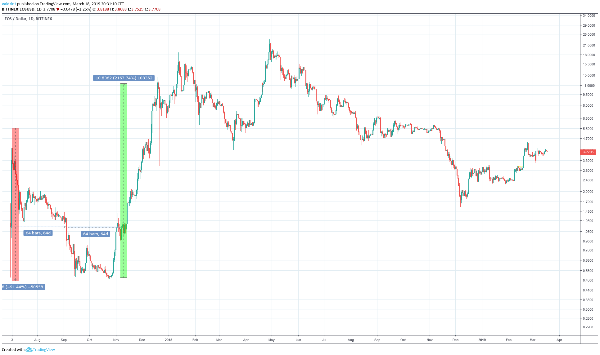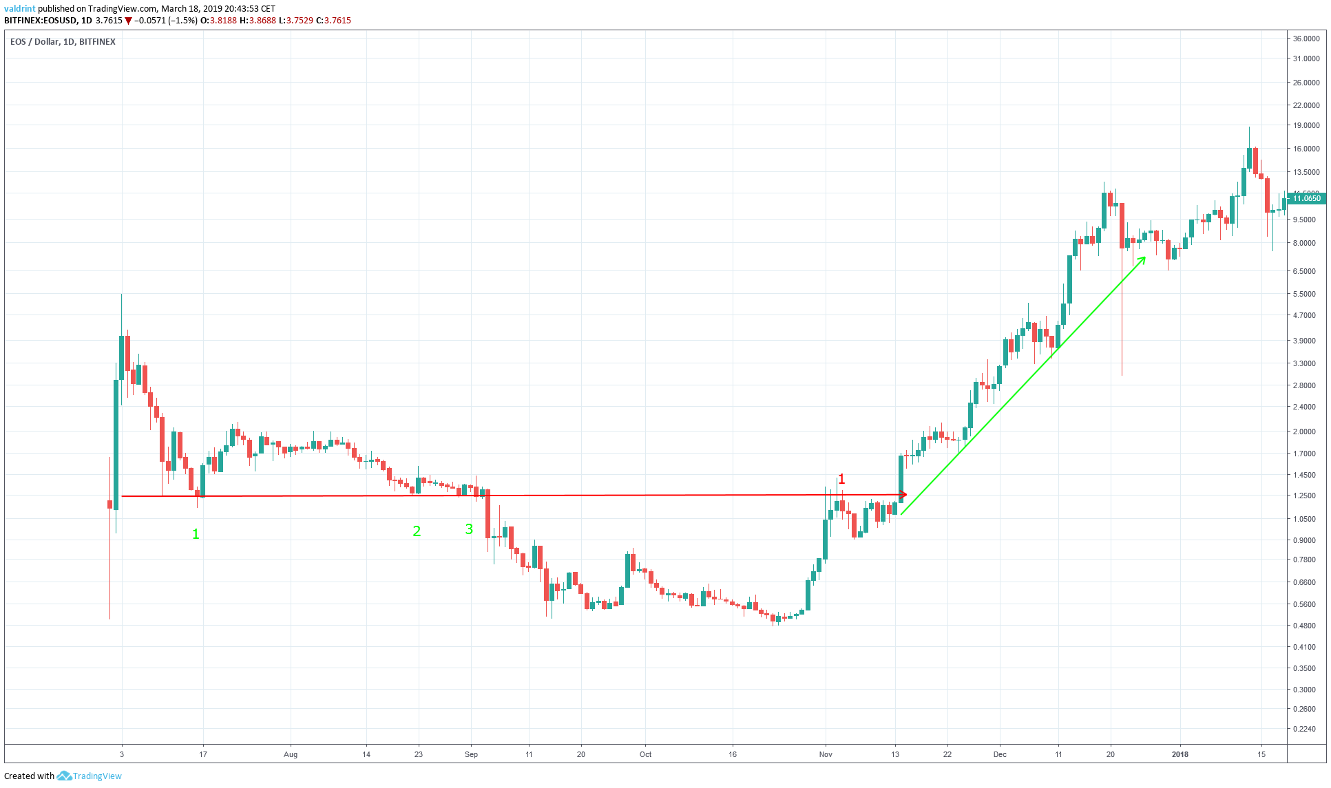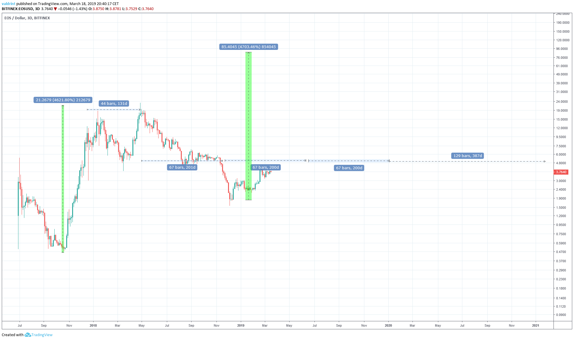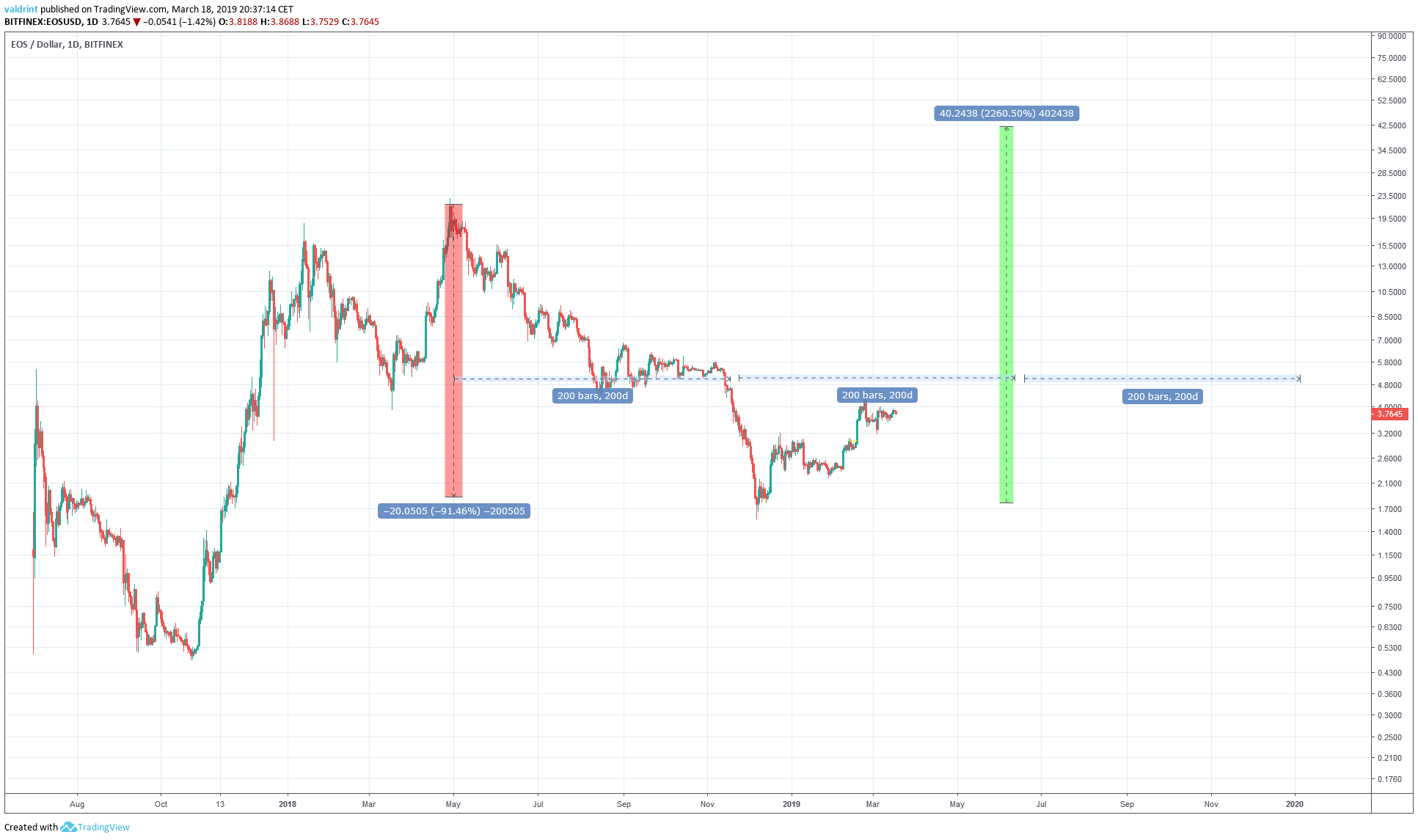 The 1:1:1 ratio between these three successive moves will be used later to make a prediction about the price of EOS in 2019-2020.