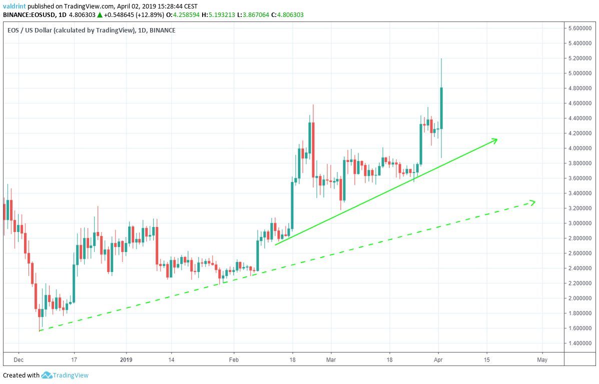 On Dec 7, 2018, the price of EOS (EOS) made a low of $1.54. It has been on a gradual uptrend since. Price increases accelerated on Feb 28, 2019.