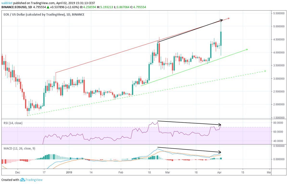 Based on these indicators, we do not believe EOS has enough strength left to break out from the ascending channel or the resistance at $5. Despite a high above $5 on Apr 2, the price is likely to drop back into the channel.