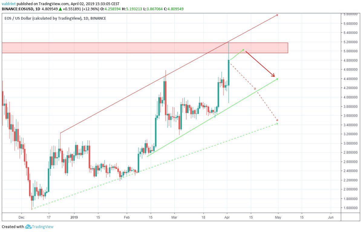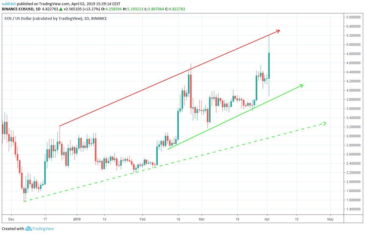 Combined with an ascending resistance line that formed in mid-December 2018, EOS has been trading within an ascending channel:
