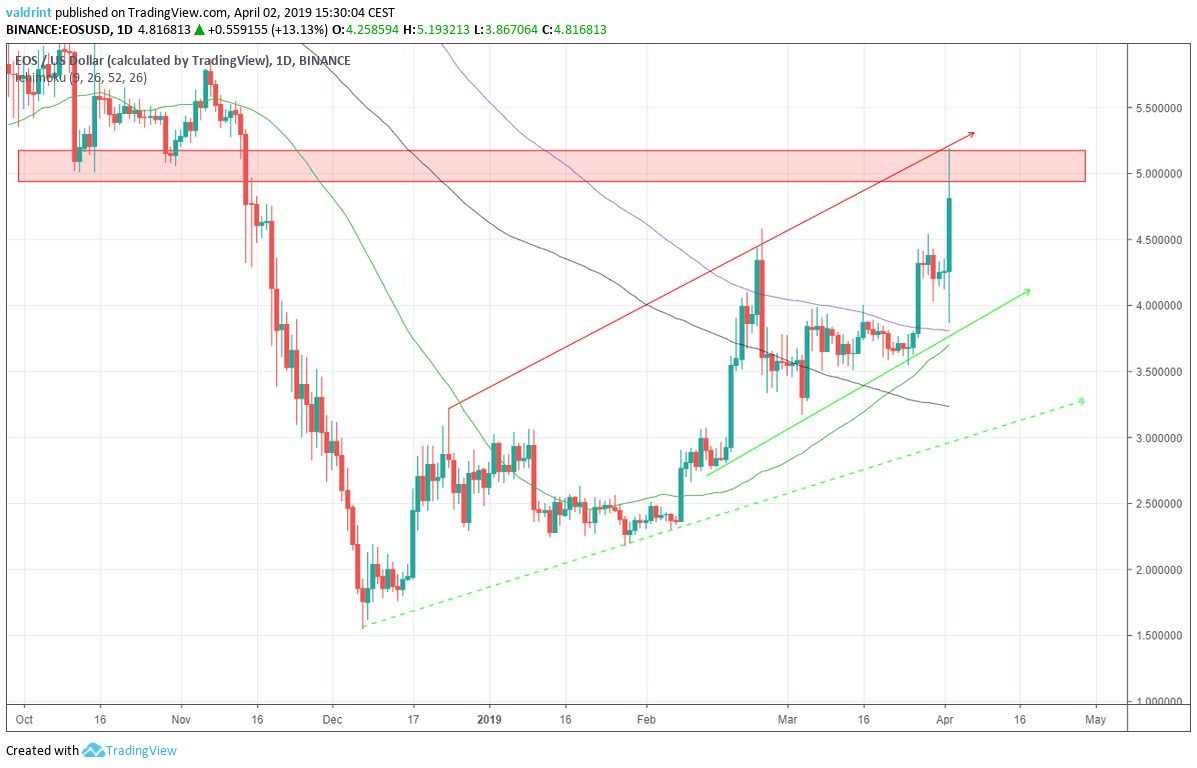 If price continues increasing at this rate, EOS will reach $5 at a later date. However, if price breaks down, EOS could crash far below this level.