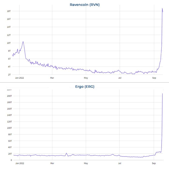 With the Merge on Ethereum now complete, miners are flocking to other networks to continue their operations. The Ravencoin (RVN) and Ergo (ERG) networks in particular are seeing large boosts in hashrate.