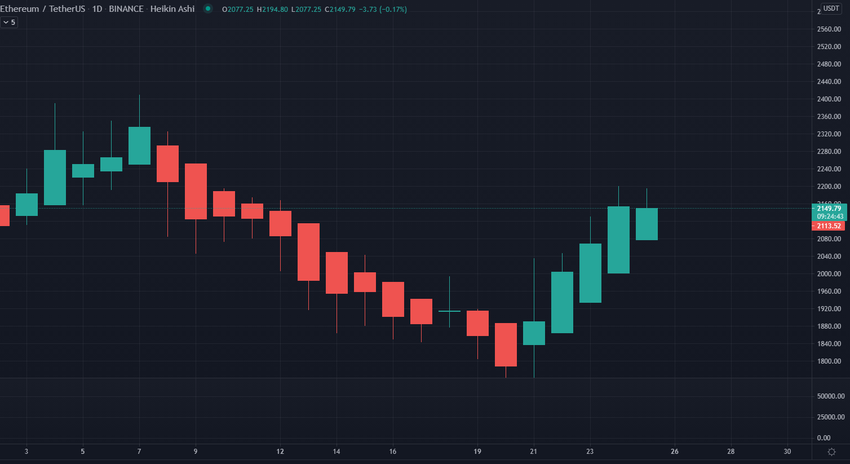 Ethereum has managed to follow bitcoin in recovering from this week’s earlier drop. The price dropped to $1,706 before five days of bullish momentum saw the price recover back over $2,000. At the time of writing, ethereum is sitting at $2,112.