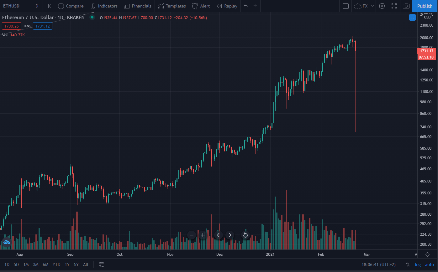 Crypto markets are in turmoil on Monday, thanks to some heavy liquidations. The ethereum (ETH) price appeared to plunge dramatically more on the Kraken exchange compared to its peers.