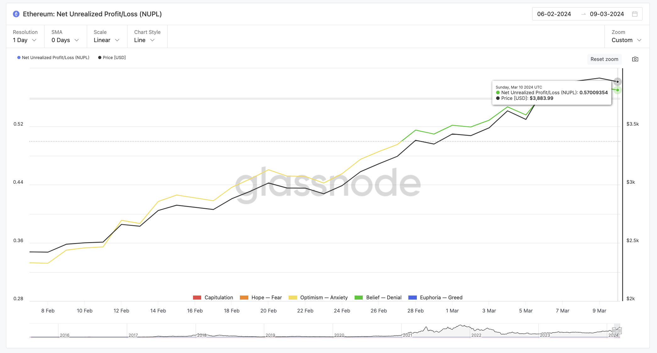 Between February 27 and February 28, the ETH Net Unrealized Profit/Loss (NUPL) indicator shifted from the ‘Optimism – Anxiety’ stage to the ‘Belief – Denial’ level. This shift suggests that most ETH holders are now in profit. It usually signals a bull market gaining momentum as investors maintain solid trust in their assets without overzealous behavior.