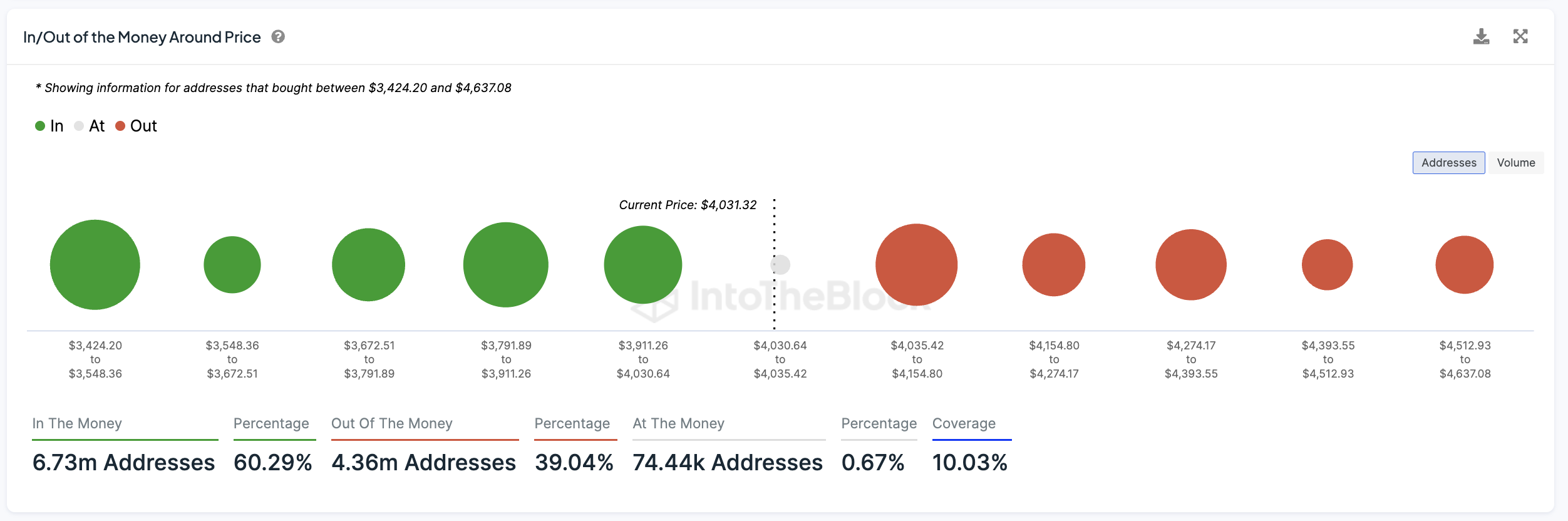 The In/Out of the Money Around Price (IOMAP) is a metric that represents where holders will likely profit or lose. It maps out the price points where investors purchased varying quantities of tokens and compares them to the current price.