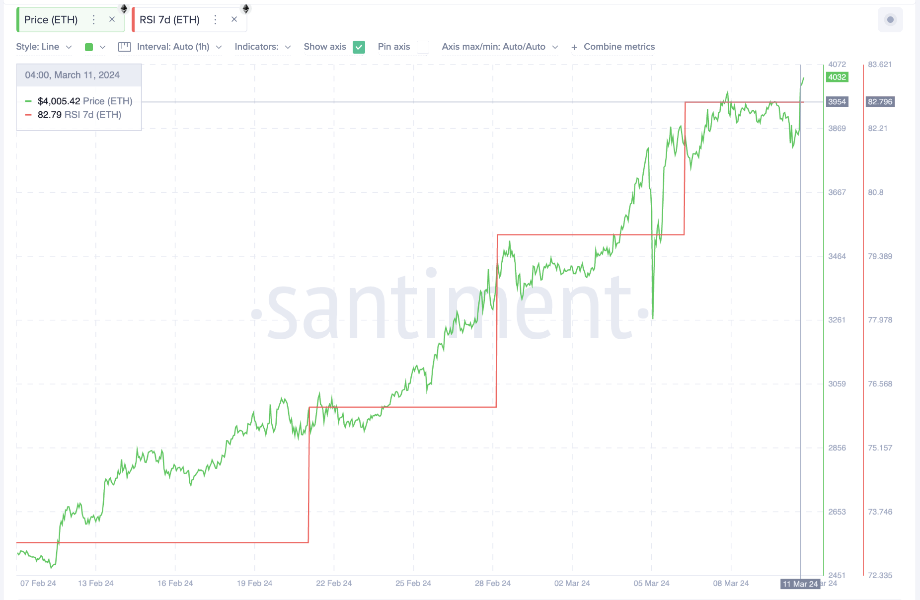 Over the past month, the RSI (Relative Strength Index) for Ethereum has seen a notable increase from 73 to 82. This rise in the RSI is a sign that Ethereum has been experiencing strong buying pressure. Traditionally, an RSI value above 70 indicates that an asset may be getting overbought, which can be a precursor to a potential pullback as the market seeks to correct and find equilibrium. However, a mere high RSI isn’t always a reliable harbinger of a downturn.