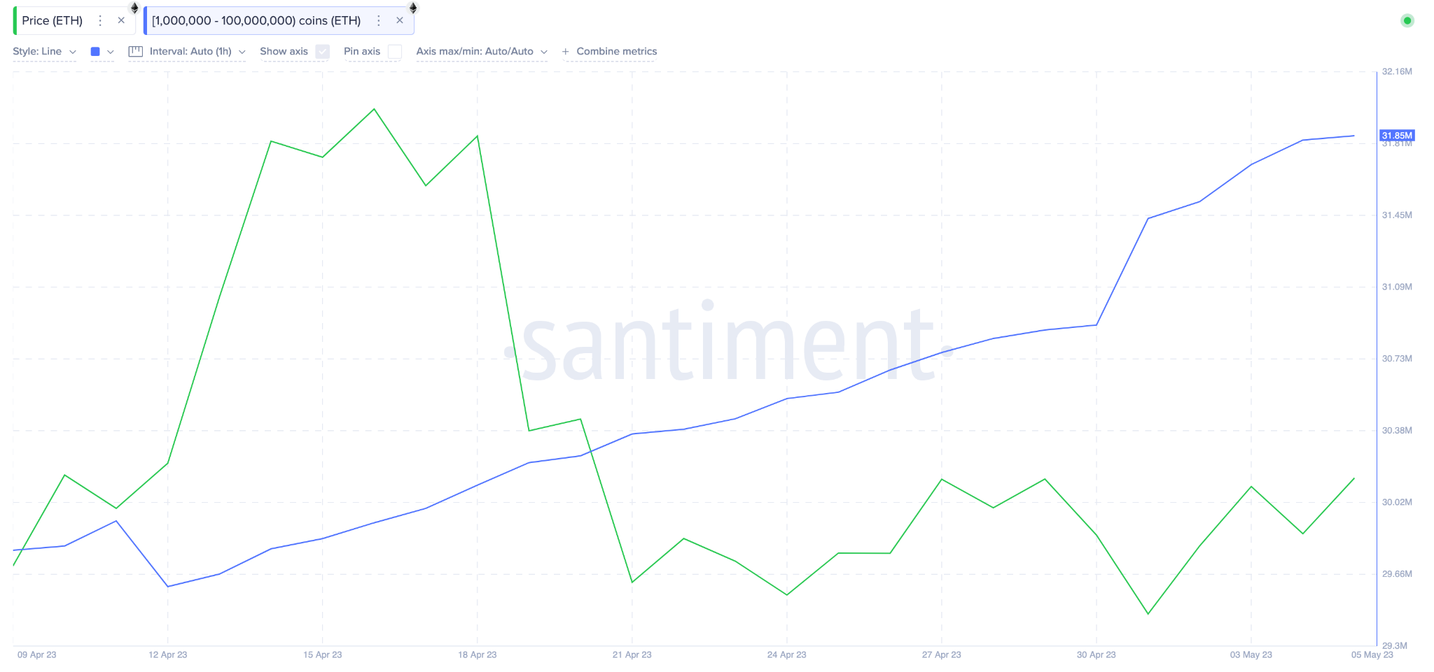 The blue line in the chart below shows how the whale cohort holding one million to 100 million coins started buying at the close of April. Between April 30 and May 5, they added 950,000 ETH to their wallet balances in just six days.