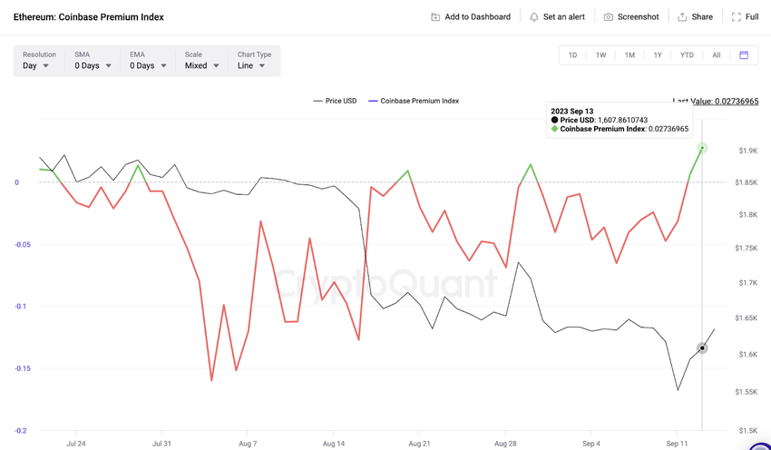 With the next Fed meeting fast approaching, a vital on-chain indicator shows US institutional investors have started mounting buying pressure. Indicatively, the chart below shows that on Sept 13, the Coinbase Premium Index hit 0.27, breaking into positive values, for the first time this month.