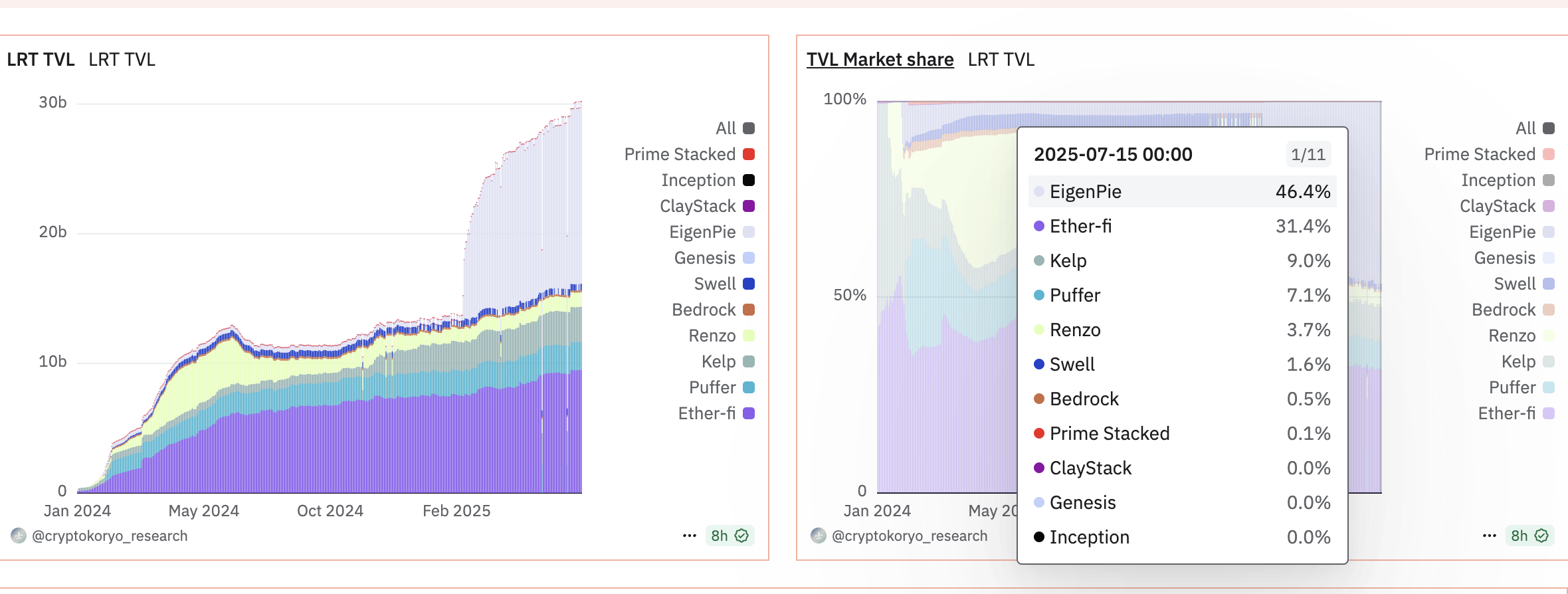 In the restaking sector, Ether.fi is one of the top players, holding a 31.4% market share. The leading position belongs to EigenPie with 46.4%.