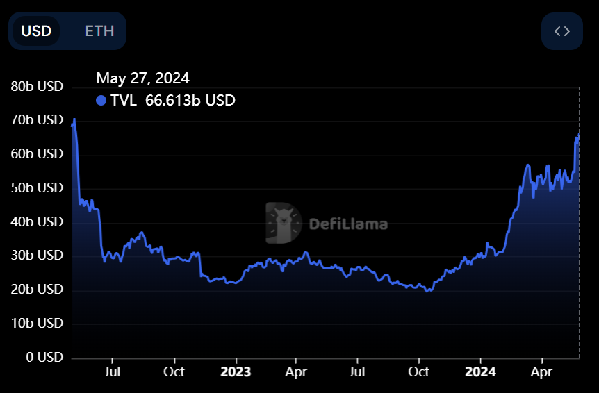 Ethereum’s decentralized finance (DeFi) ecosystem has also experienced a surge. DefiLlama data shows that the total value locked (TVL) in Ethereum’s DeFi is $66.61 billion as of May 27, marking its highest TVL since mid-May 2022.