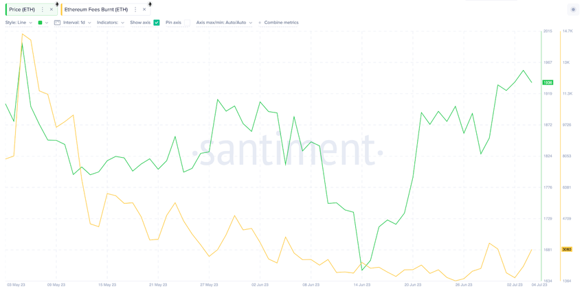 In May 2023, Ethereum witnessed a spike in burn rate due to the memecoin rave triggered by the advent of PEPE. At peak, about 14,600 ETH were burnt on May 5, destroying millions of dollars worth of coins. But since then, the burn rate has reduced significantly.