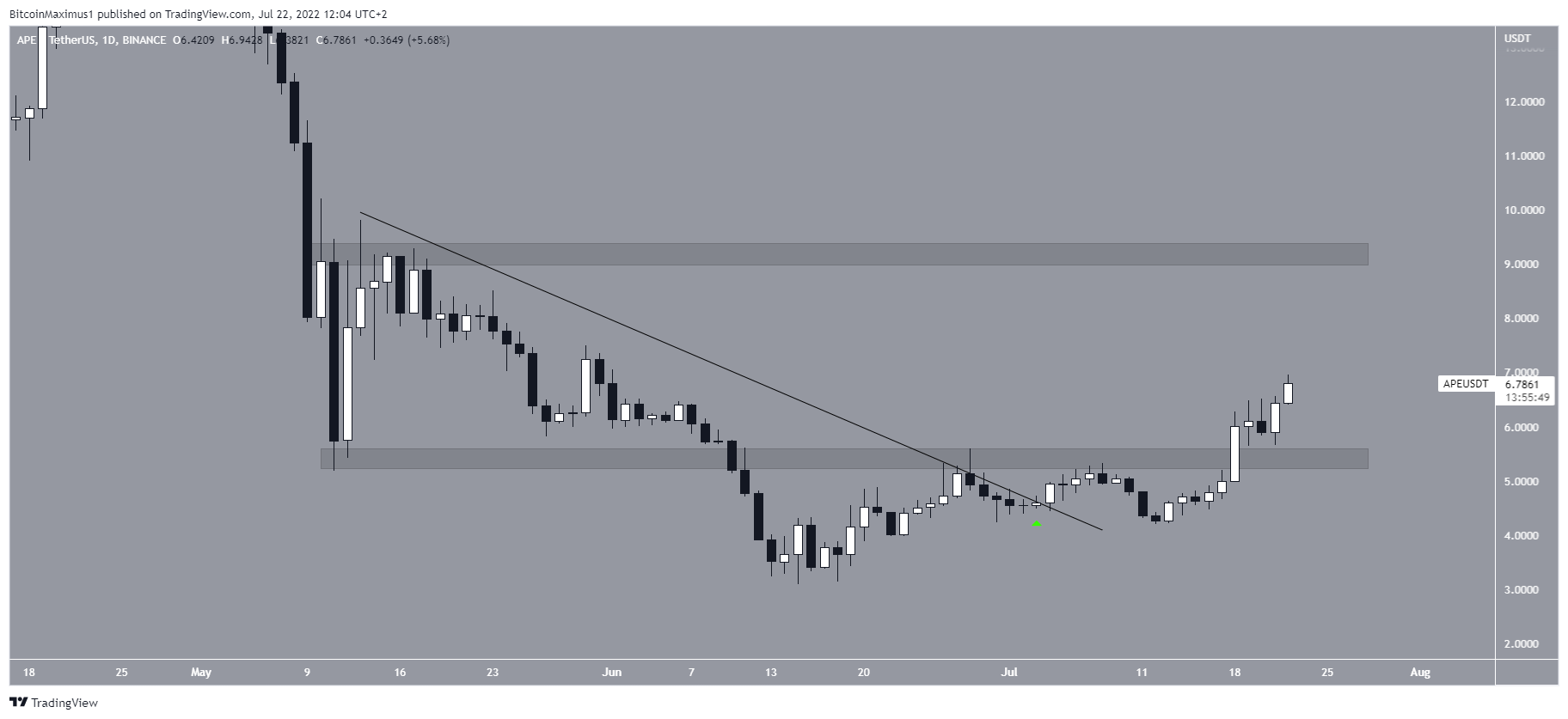 APE has been moving upwards since June 15 and broke out from a descending resistance line on July 3 (green icon). After a slight retracement, it resumed its upward movement and reclaimed the $5.40 horizontal area on July 18.