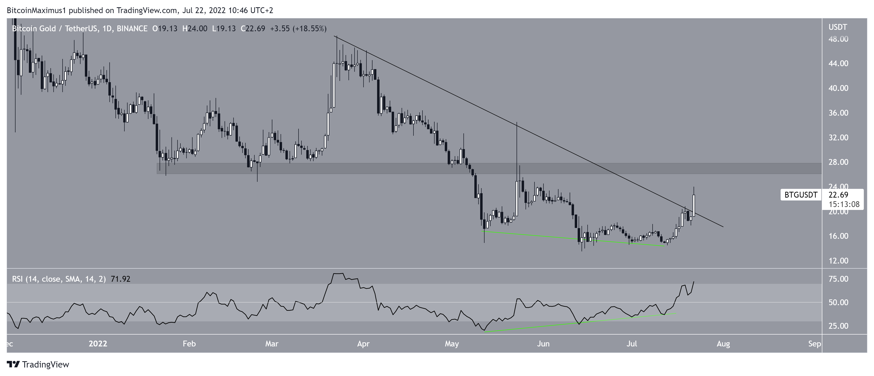 BTG had been decreasing underneath a descending resistance line since March 23. Beginning in May, it created a triple bottom pattern, which was combined with bullish divergence in the RSI. The triple bottom is considered a bullish pattern, and the RSI reading further increases its legitimacy.
