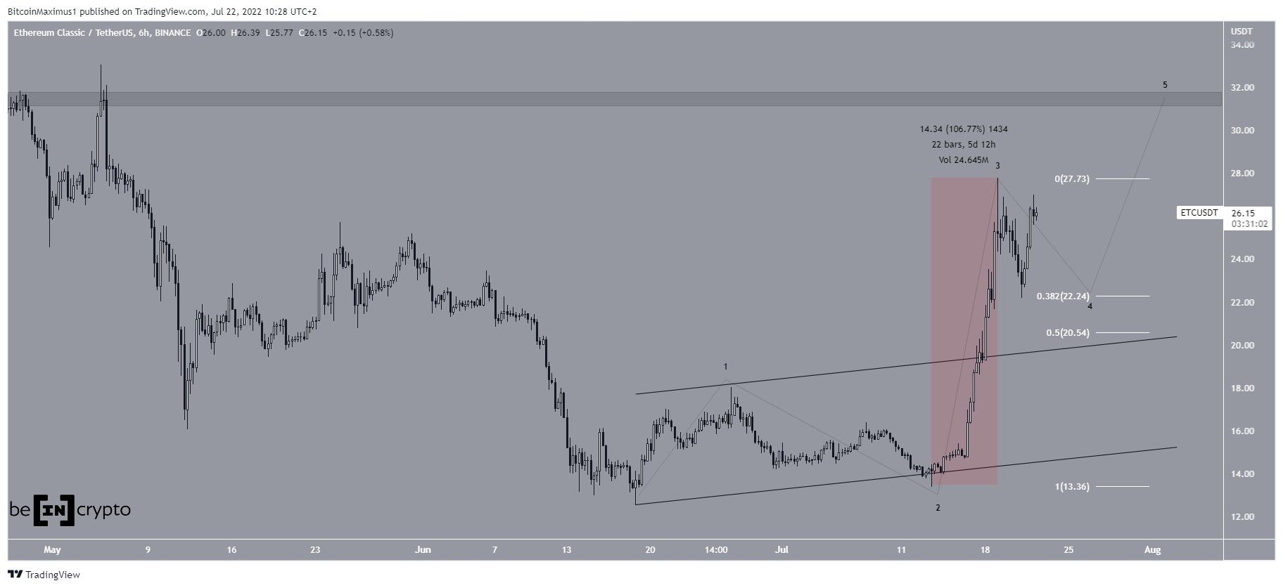 ETC has been moving upwards since June 19. it accelerated its rate of increase after creating a higher low on July 13 and broke out from an ascending parallel channel afterwards. In a span of five days, ETC increased by 107%, leading to a high of $27.77 on July 19.