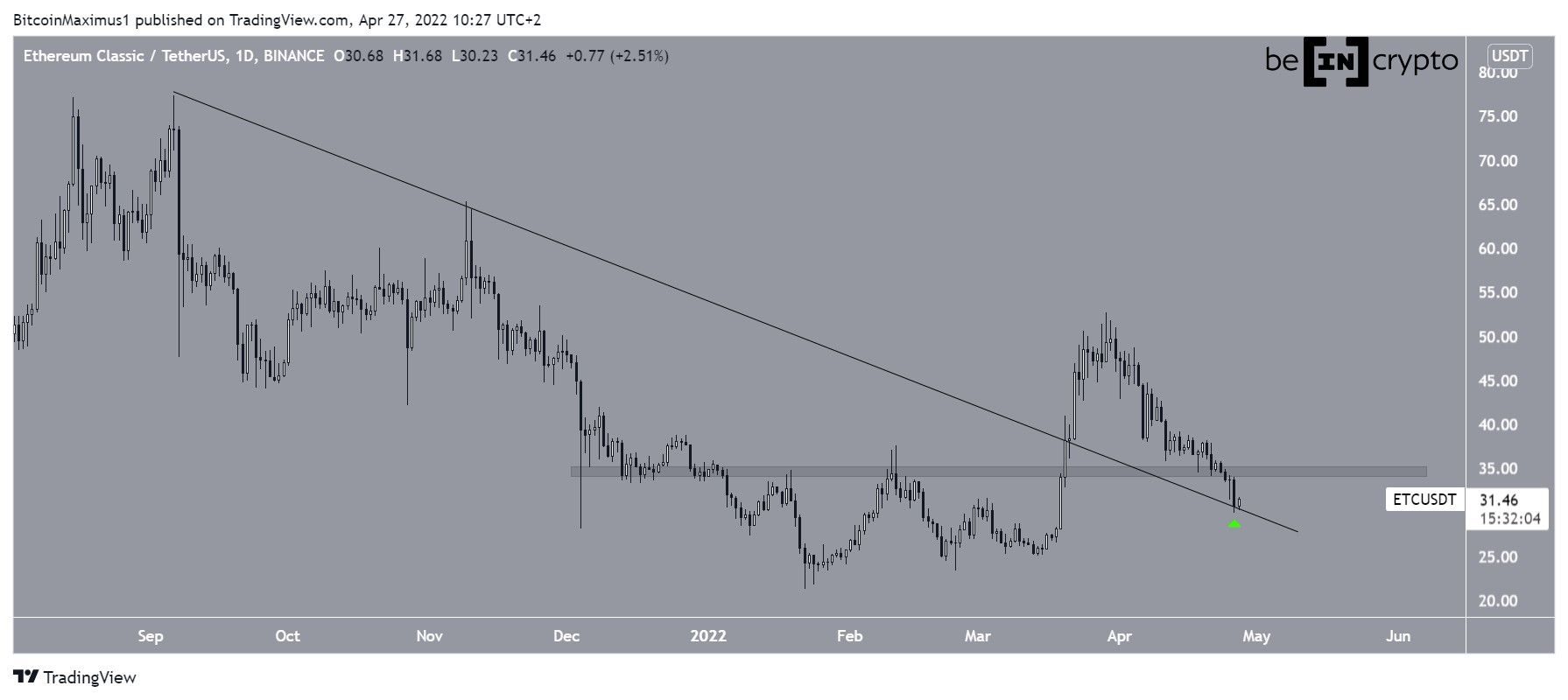 During the decrease, ETC broke down below the $34.50 area, which is now expected to provide resistance.Â