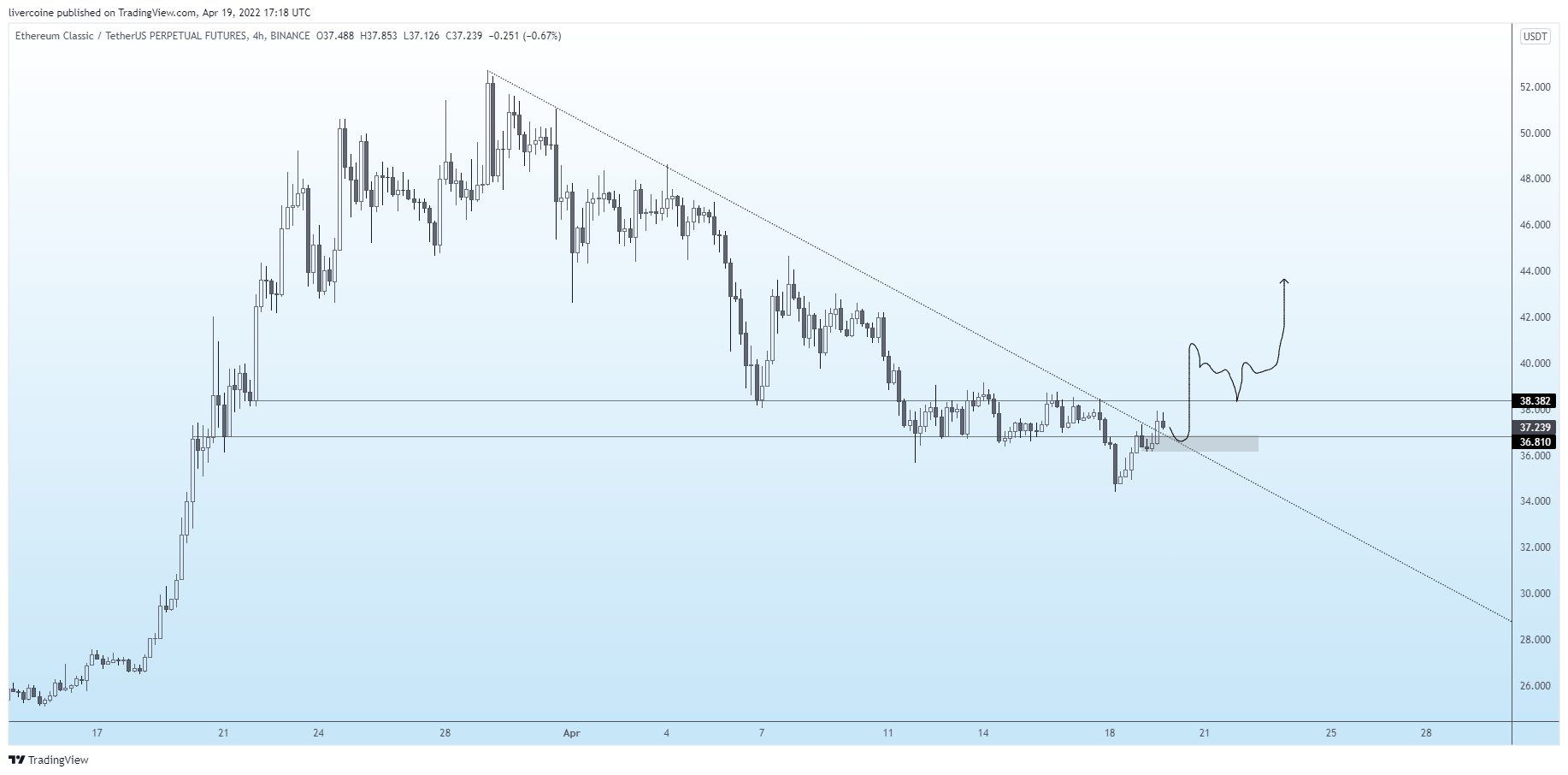 Cryptocurrency trader and investor @livercoin tweeted a chart of ETC, stating that the price could soon break out from a descending resistance line.