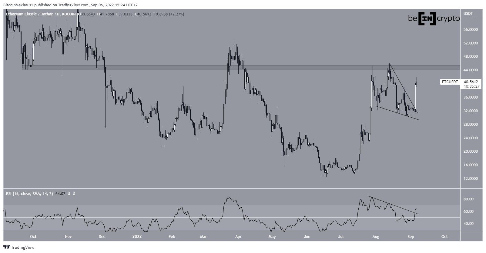 Ethereum Classic (ETC) has broken out from a short-term pattern and is approaching a crucial resistance area at $45.