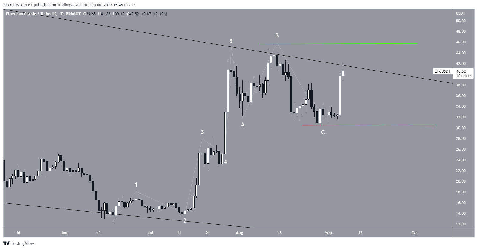 The wave count also supports the continuation of the upward movement. The most likely count indicates that ETC has completed a five-wave upward movement (white) and an A-B-C correction afterwards.
