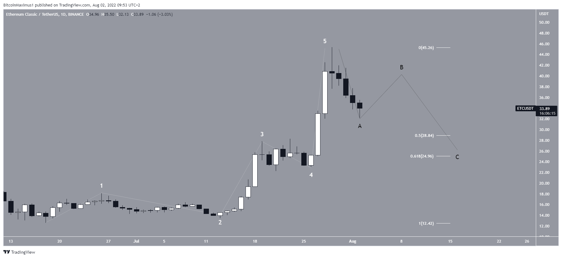 The most likely wave count suggests that since the June 18 low, ETC has completed a five-wave upward movement (white). Therefore, it has begun a new bullish trend.