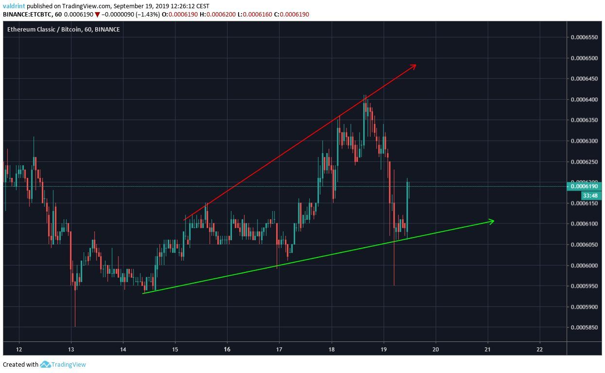 The hourly chart shows that the ETC price is trading inside an ascending broadening wedge.