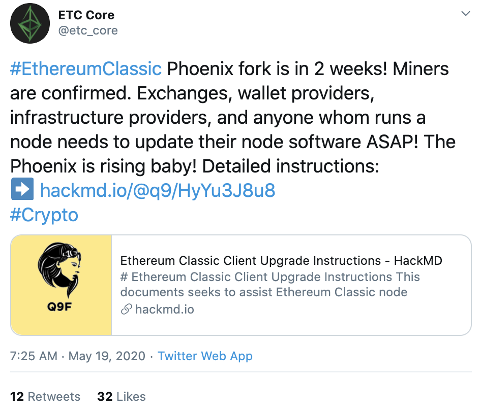Miners for Ethereum Classic (ETC) will soon have to shift gears. The network will be undergoing a hard fork in two weeks called Phoenix.