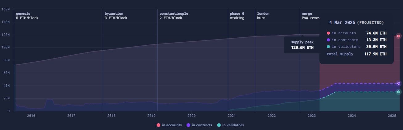 At these rates, the Ethereum supply is projected as 118.1 million by the year 2025. Issuance rewards for stakers will stand at around 4% per year, trumping the burn rate for non-stakers, which is 1.8% per year. The supply should also have a pearl of 120.6 million ETH at current levels over the next two years.