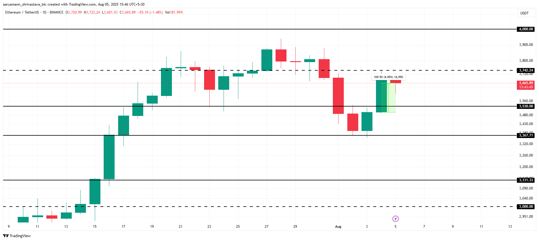 Ethereum’s price has risen by 4.85% over the last 24 hours, trading at $3,665 at the time of writing. Ethereum is currently facing resistance at $3,742, the last barrier before a potential move toward the $4,000 mark.