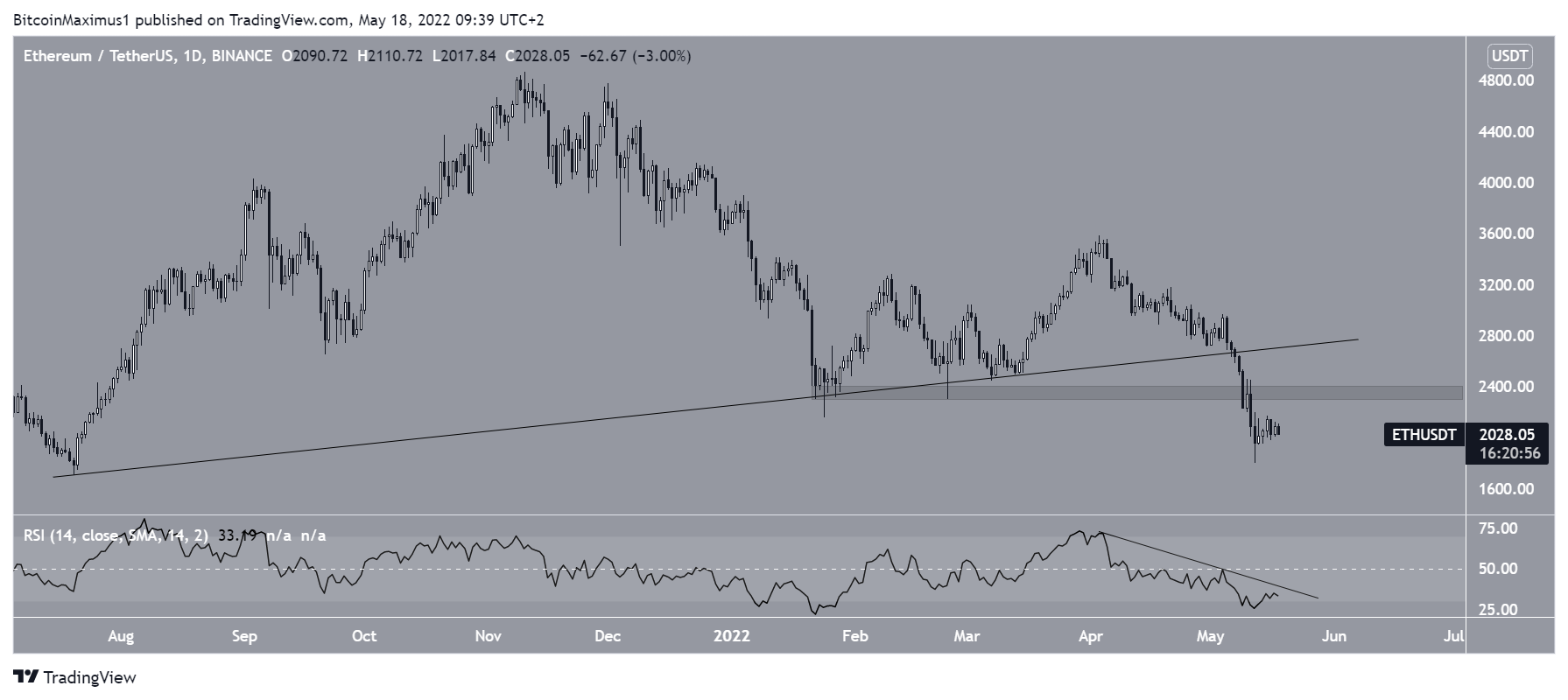 The daily RSI is also bearish since it is below 50 and is following a descending resistance line. Additionally, there seems to be a strong resistance area at $2,350.Â
