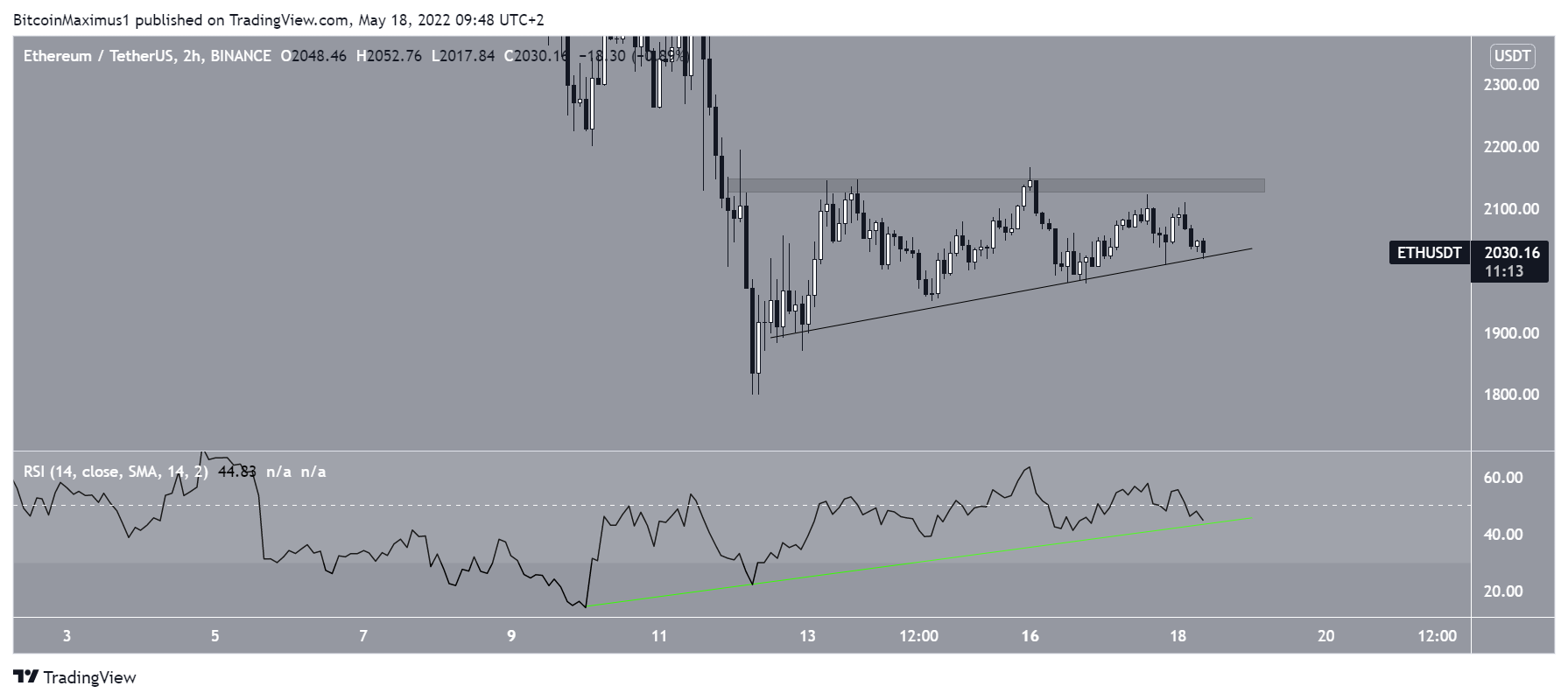 Despite the bearishness from the weekly and daily time frames, the two-hour chart is not as bearish, since it shows that ETH could be trading inside an ascending triangle. This is considered a bullish pattern, meaning that it would lead to breakouts the majority of the time.Â