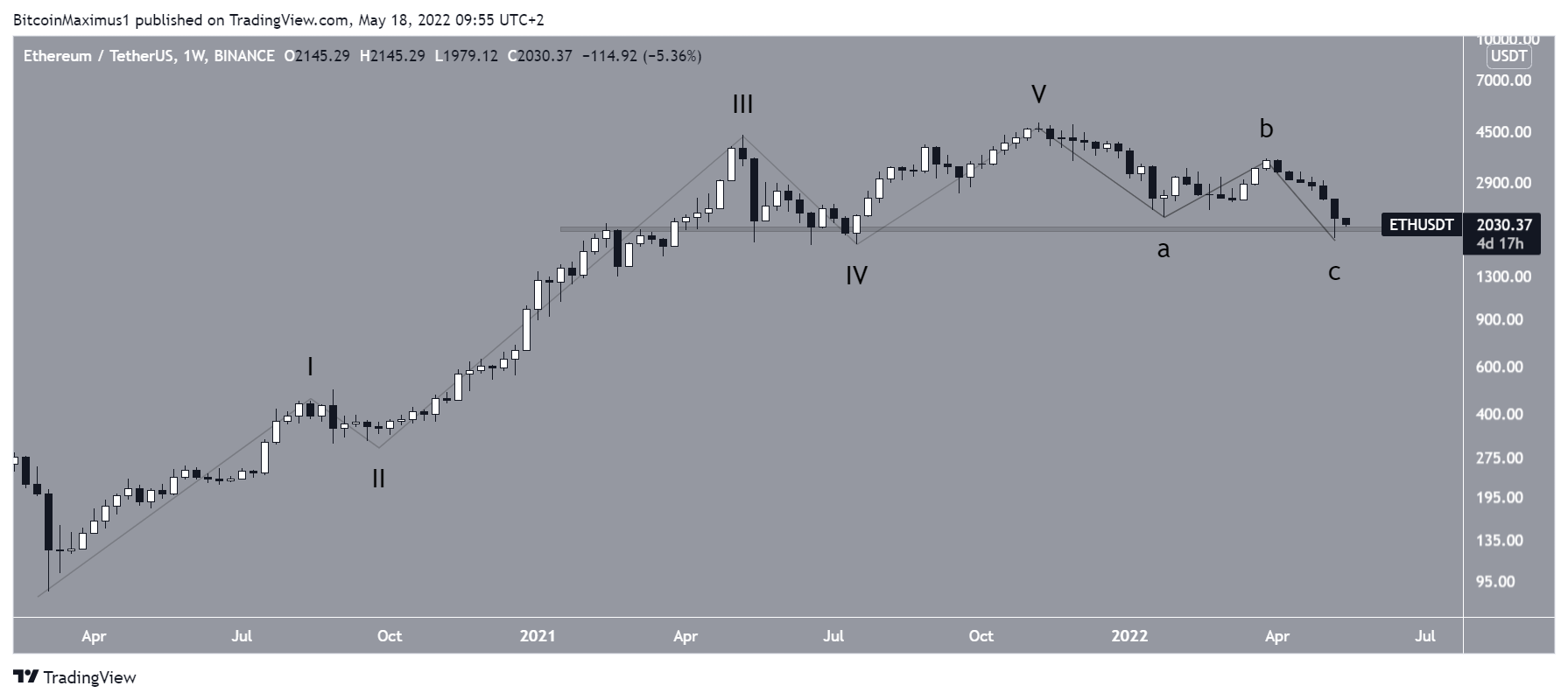 The long-term wave count suggests that ETH has completed a five-wave upward movement (black) that began in March 2020. If so, the price has now begun an A-B-C corrective structure, which might or might now have ended.