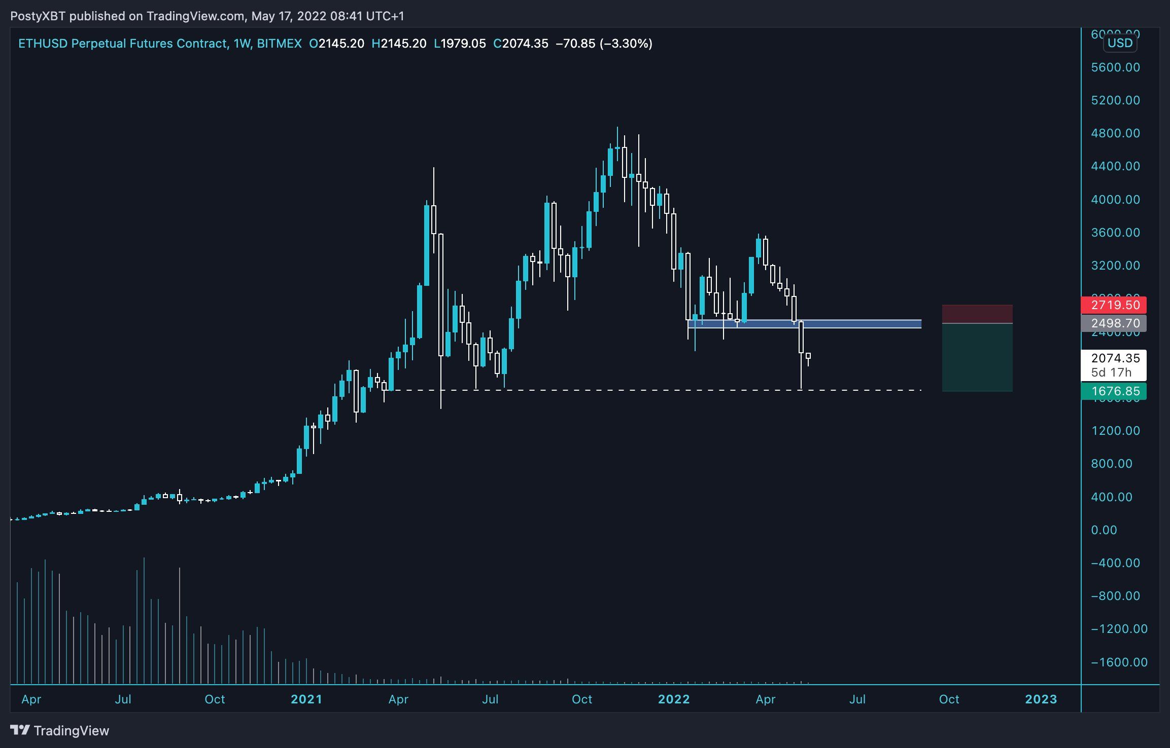Cryptocurrency trader @postyxbt tweeted a chart of ETH which shows that the price has bounced at the $1,920 horizontal area. He indicates that he would short a re-test of the $2,500 area. A look at lower time frames is required in order to determine if the price will get there.