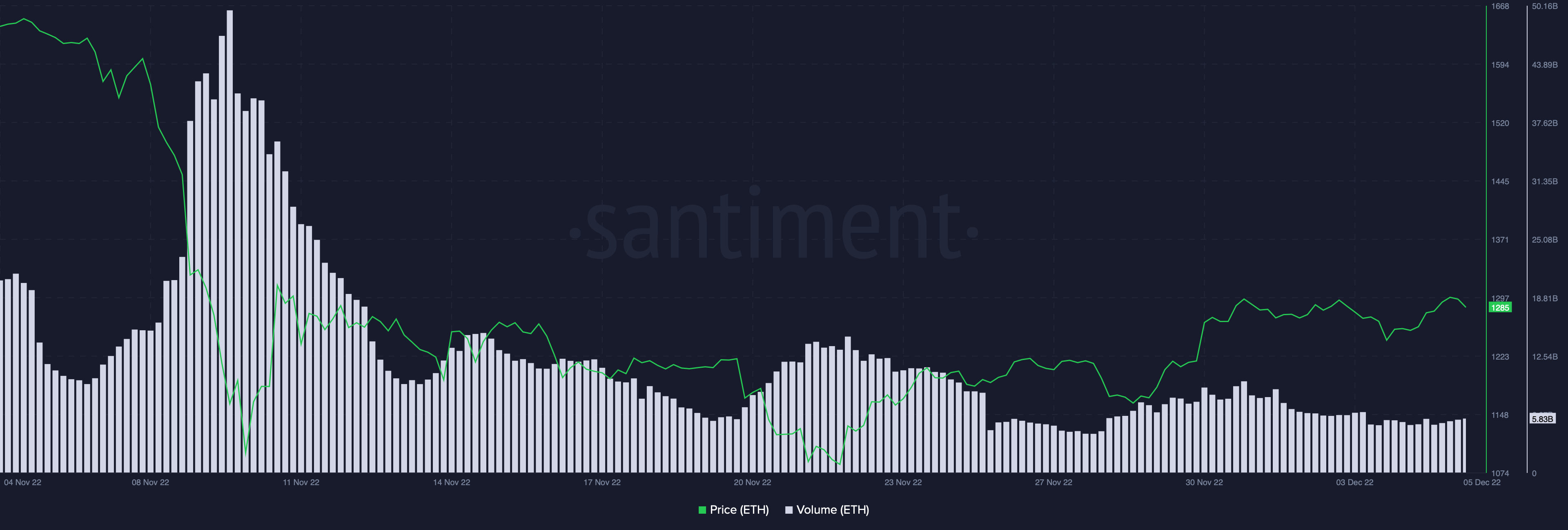 However, a look at the trade volumes for ETH suggested lower volatility in the market. Volumes have made lower highs and continued to flatten. This could mean that ETH bulls can face difficulties pushing price action up.