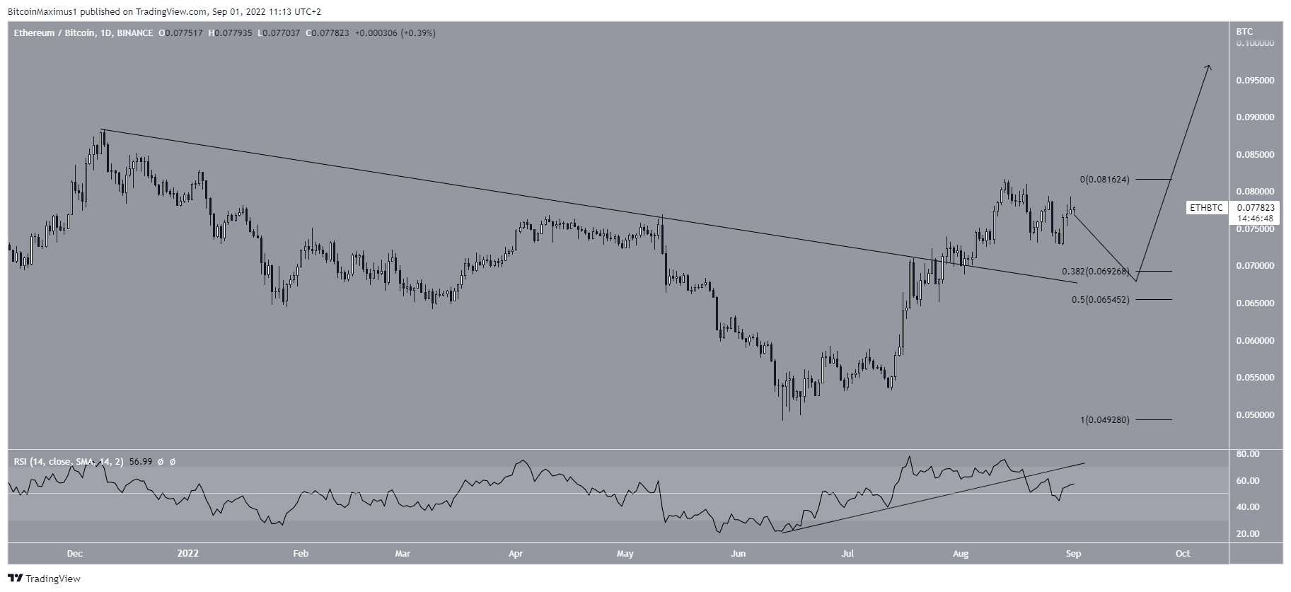 So, it is possible that it will return to the 0.382 Fib retracement support level at ₿0.069, validating the resistance line as support, before resuming its upward movement.