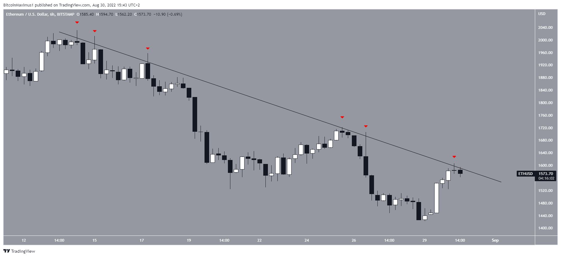 ETH has been falling underneath a descending resistance line since reaching a high of $2,031 on Aug 14. So far, it has made six attempts at breaking out (red icons).Â