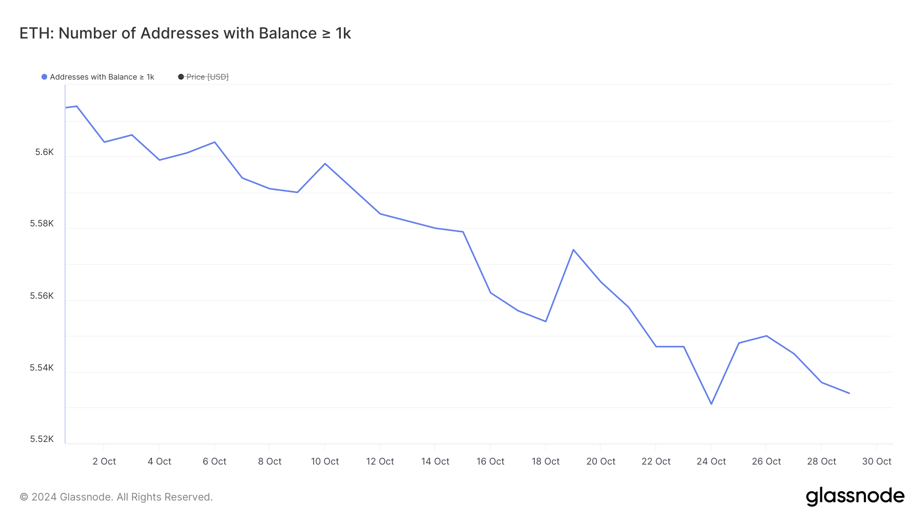 Despite ETH being up 7.54% in the last week, whale activity suggests that large holders are still uncertain. The number of addresses holding at least 1,000 ETH has been on a decline since the beginning of October, dropping from 5,614 on October 1 to 5,534 by October 30.