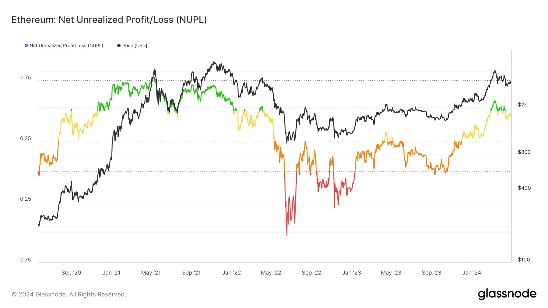 As evident from the Net Unrealized Profit/Loss (NUPL) indicator, the ETH holders still hold substantial gains. This fuels their optimism of a rally as they stand in the same sentimental zone.