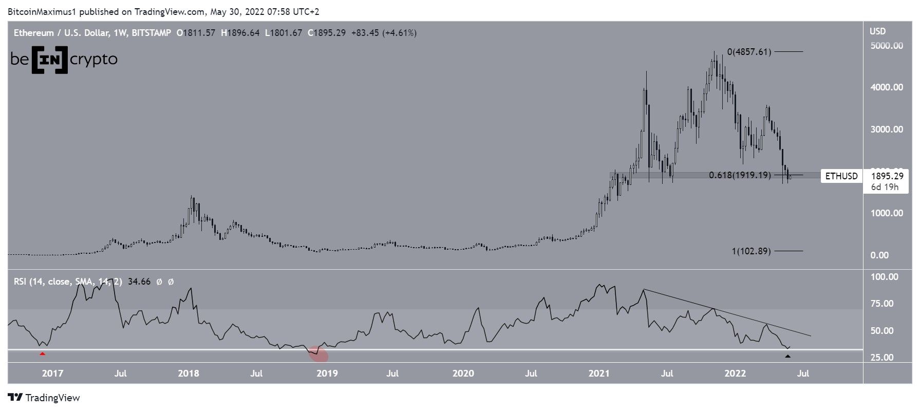 The weekly chart shows that ETH has been falling since reaching an all-time high price of $4,868 on Nov 10. The downward movement led to a low of $1,700 on May 27.