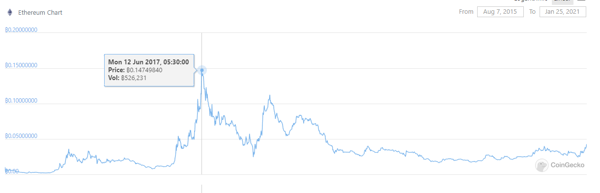 Ethereum proponents also point out that it’s still far from its previous ATH when priced against Bitcoin. The ETH/BTC trading pair is traditionally used to gauge the cryptocurrency’s relative strength.