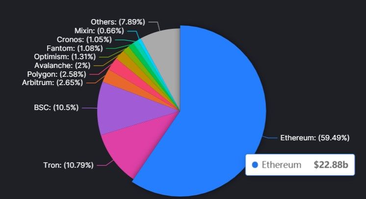 Ethereum, however, continues to rule the DeFi sector. With more than 620 decentralized finance protocols, ETH has the biggest total value locked (TVL) of any chain at $22.88 billion.