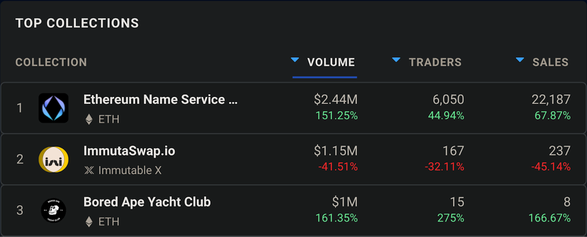 With $2.44 million in trading volume over the past 24 hours, ENS is currently No.1 among the top non-fungible token collections, according to DappRadar.