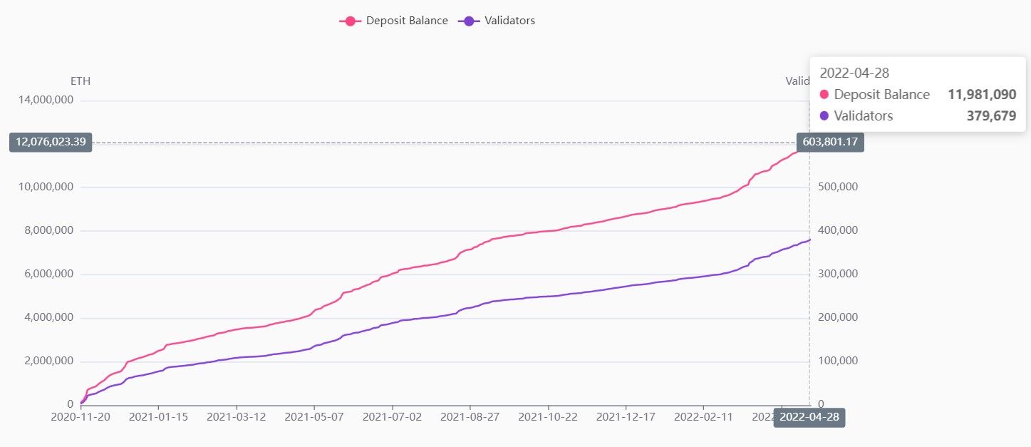 Another crucial parameter to look at is ETH staked before the recently-delayed timeline for the Merge. In Q1, ETH staked rose 111% to 10.9 million compared with 5.2 million during the same time last year. Total ETH staked on the Beacon Chain is over 12 million, according to EthSta.