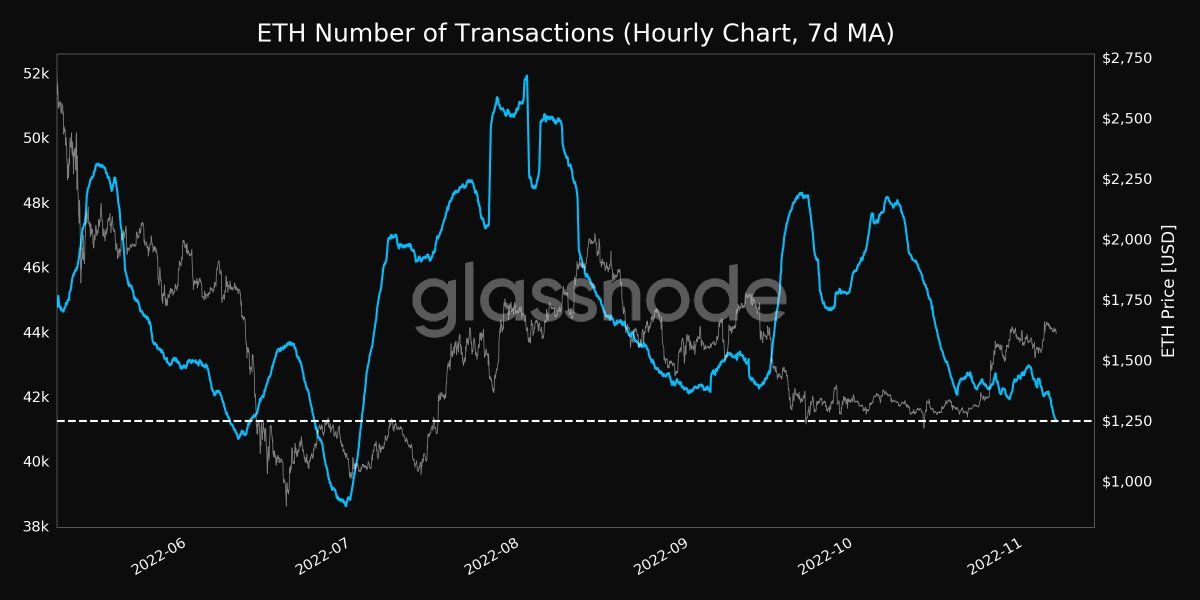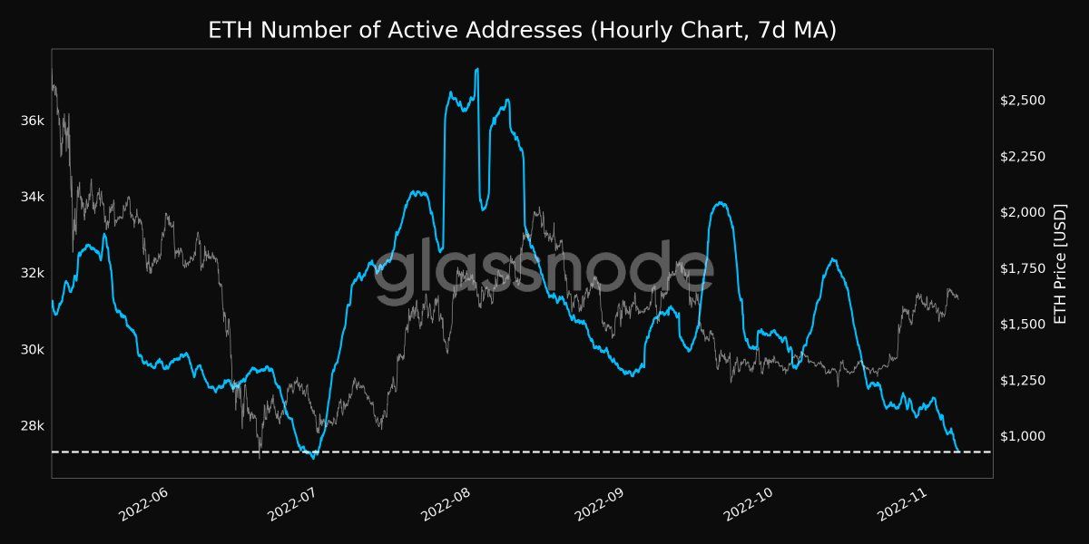 One of the reasons behind ETH weakening price momentum was the dwindling number of active addresses. Data from Glassnode showed that Ethereum number of active addresses (7d MA) reached a four-month low of 27,303.357 on Nov. 7.