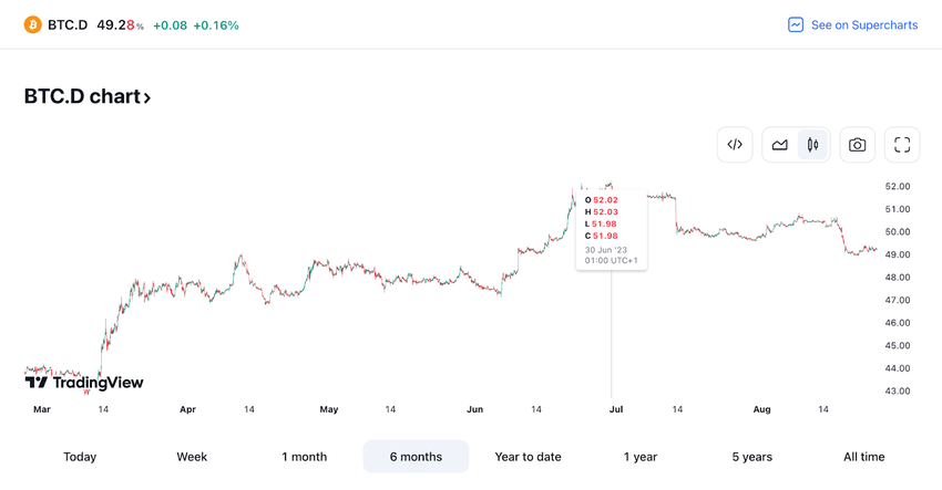Bitcoin Dominance (BTC.D) has steadily declined over the past two months as crypto investors switched focus to the altcoin market. The TradingView chart below shows that BTC.D peaked at 52% at the end of June 2023.