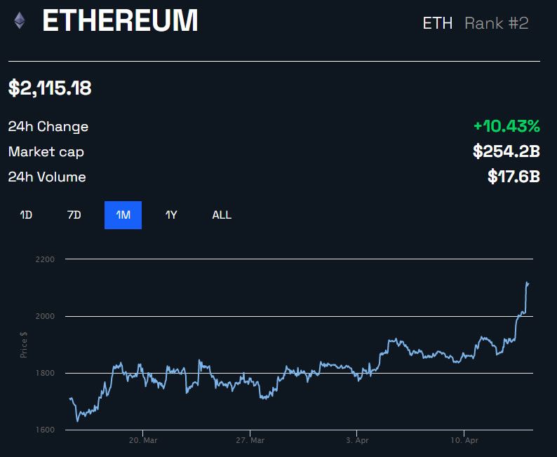 SponsoredAt the time of writing, ETH was changing hands for $2,115 following a 24-hour surge of 10.4%. Furthermore, it has outperformed Bitcoin, which only added 2% on the day.